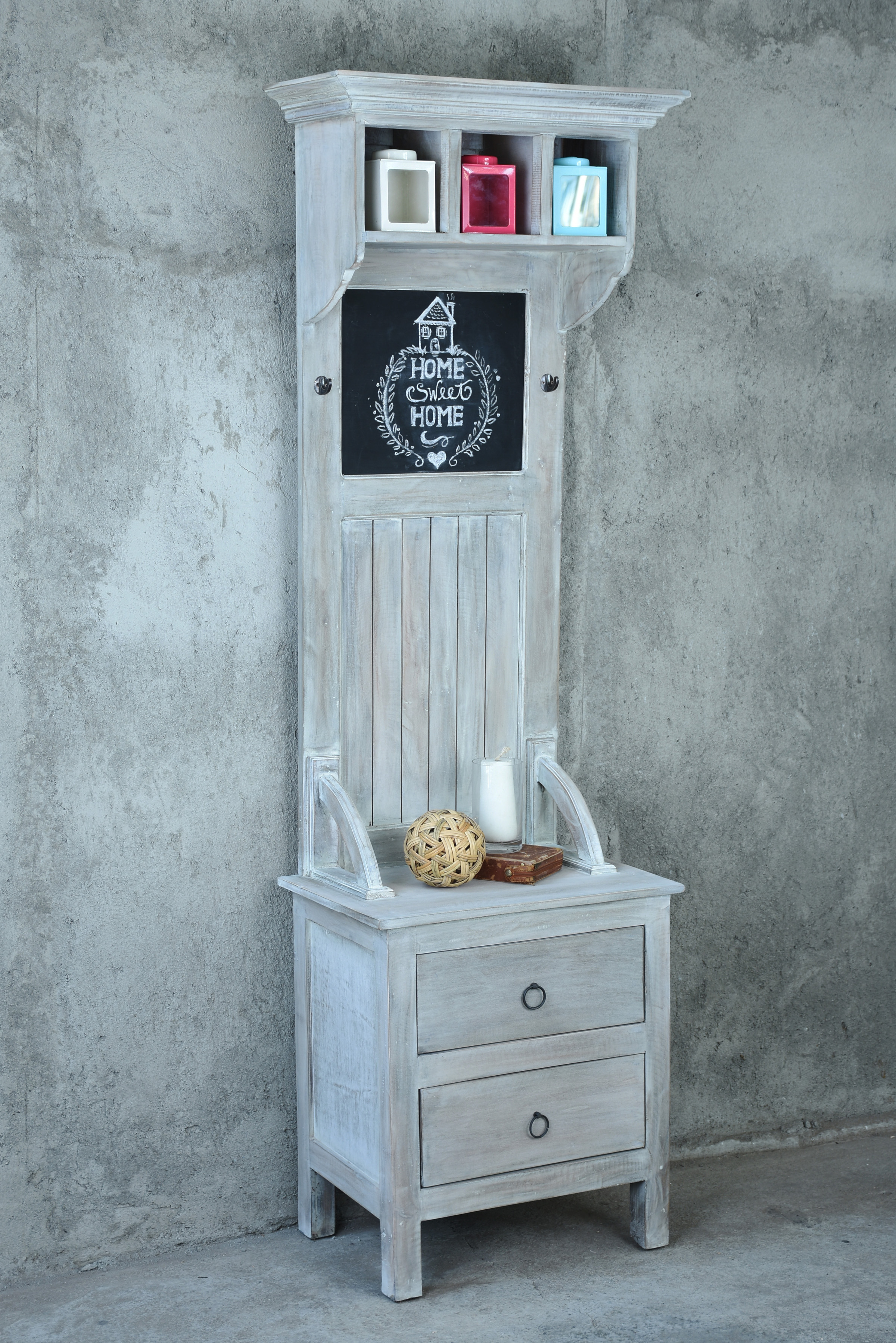 This handy storage design is fully assembled and constructed from solid recycled plantation Mahogany wood, the weathered exterior relaxes the traditional shape with two hooks for a coat or cape. Three cubbies on top are ideal to keep things out of the way from your little one, while the chalkboard is just right to write reminders of what needs to get done. Keep essentials in the two bottom drawers, like umbrellas and school bags that are necessary before you walk out the door. Have a powder room that needs more storage space, the seat serves double duty as place for your guest bag or a make-up case.