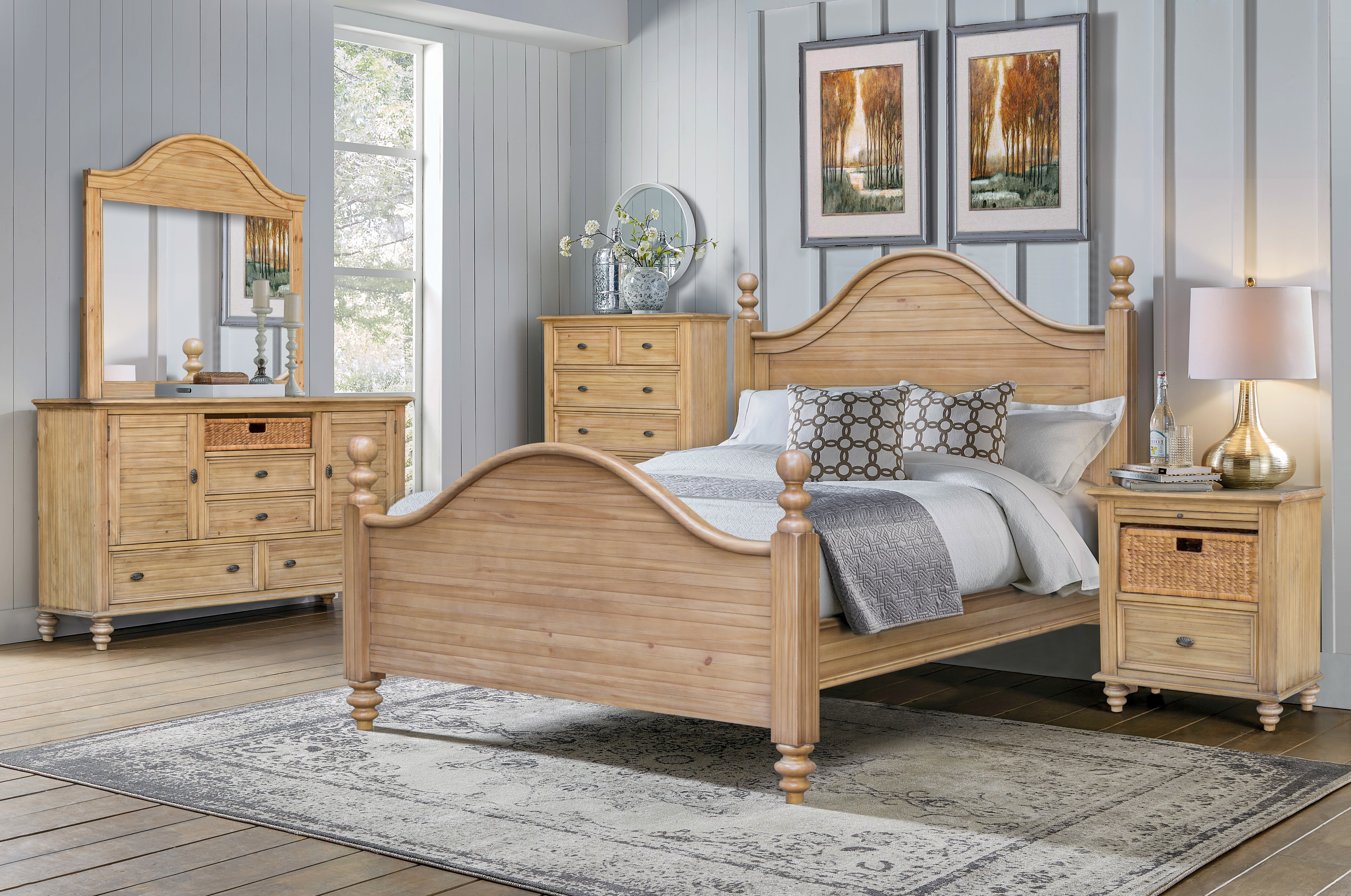 French countryside inspired, romantic arched headboard adds delicate movement to this solid Acacia and New Zealand pine wood bedroom collection. Decorative turned wood finials cap the majestic bedposts, leading your eyes up, then down to the carved turned ball feet, with a feeling of serenity in between.Read More