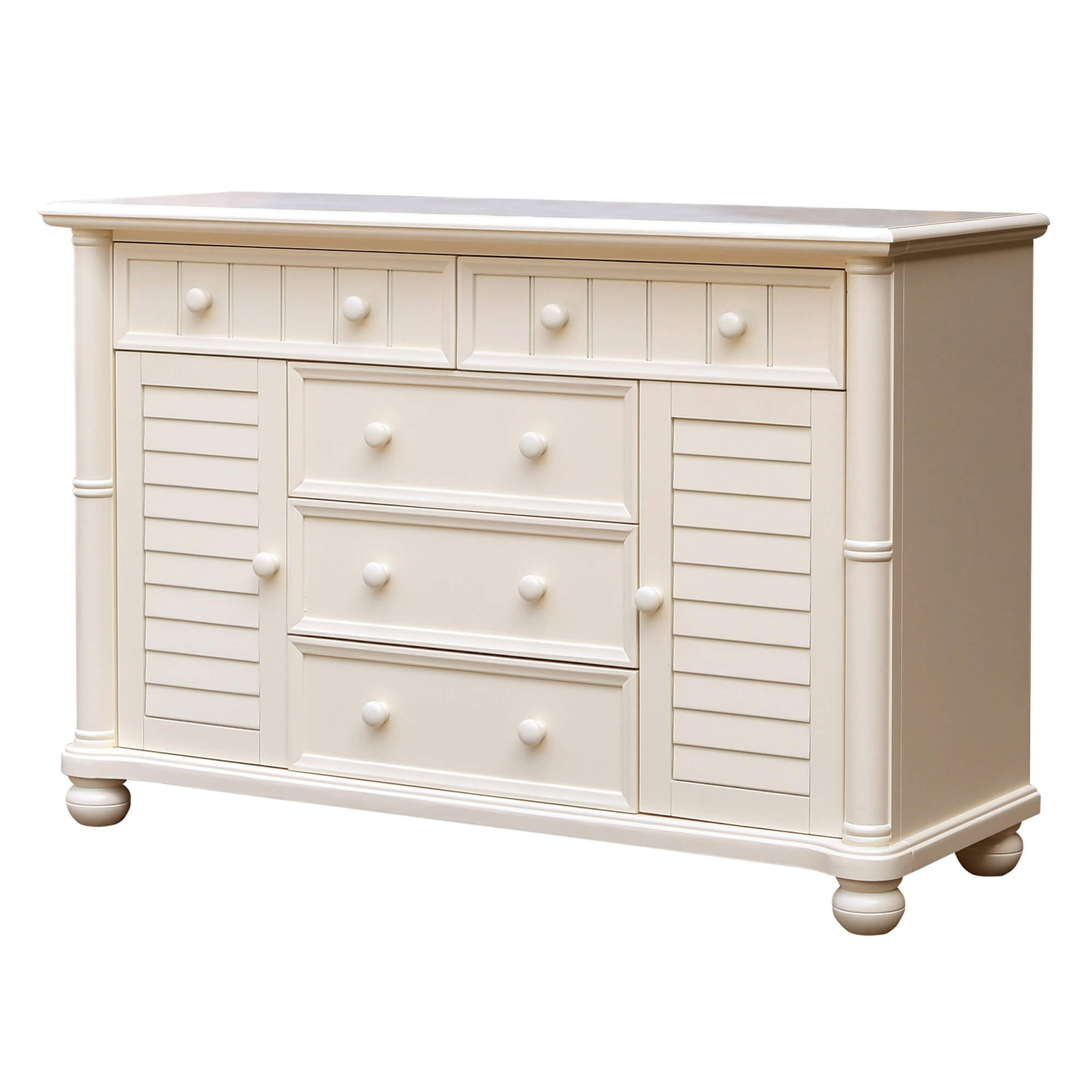 Contemporary lines united with a beadboard panel, traditional turned ball feet and finials create transitional farmhouse and island appeal. The off-white finish feels as good as it looks, durable yet smooth to the touch.