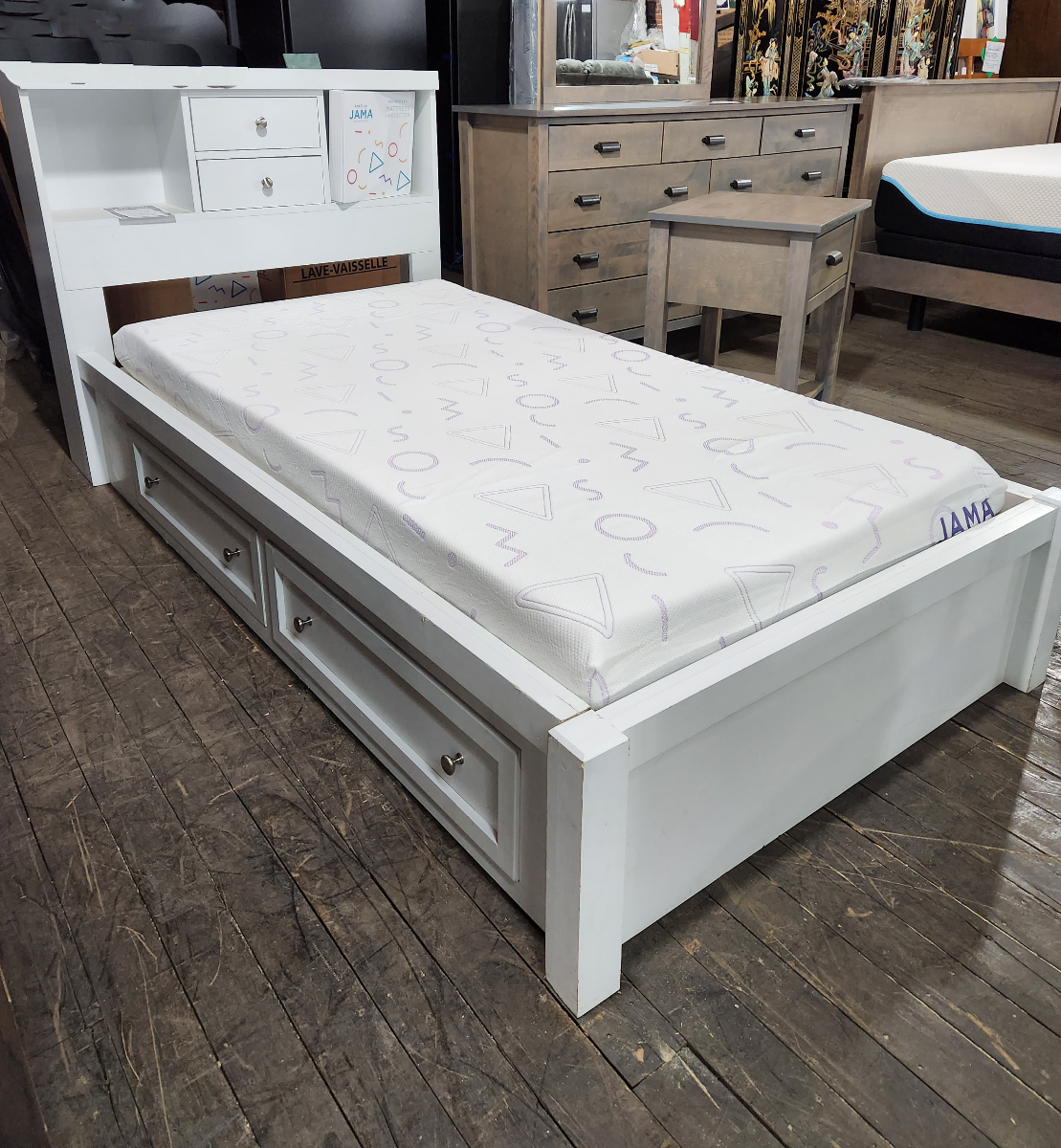 Your storage solution is here in this custom Twin bed with bookshelf headboard and under-bed storage drawers. This clean, modern child's bed will match any decor.